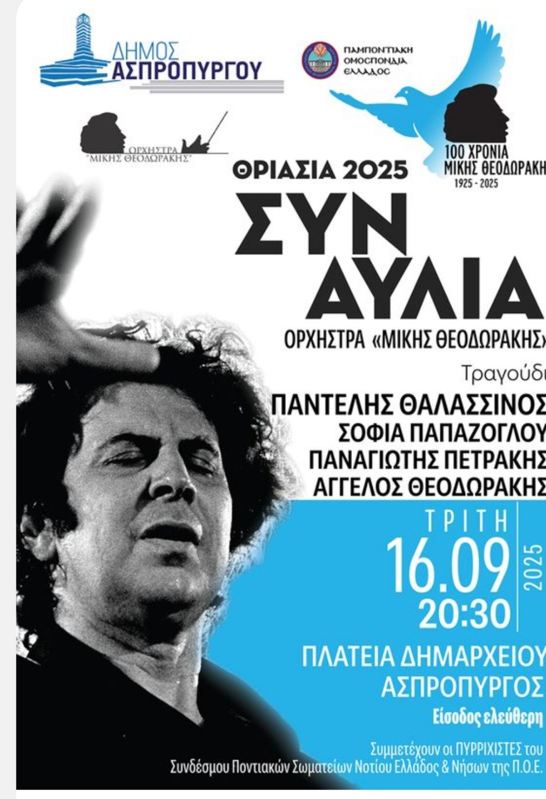 Ο Δήμος Ασπροπύργου και η Παμποντιακή Ομοσπονδία Ελλάδας τιμούν το Αφιερωματικό έτος Μίκη Θεοδωράκη με μια μεγαλειώδη συναυλία – φόρο τιμής στον σπουδαιότερο Έλληνα Συνθέτη, Μίκη Θεοδωράκη, με προσκεκλημένους την Ορχήστρα που ίδρυσε ο ίδιος ο Συνθέτης το 1996 (και συμμετέχουν οι δύο εγγονοί του) και τον σπουδαίους ερμηνευτές Παντελή Θαλασσινό, Σοφία Παπάζογλου, Παναγιώτη Πετράκη και τον Άγγελο Θεοδωράκη. Η εκδήλωση που θα πραγματοποιηθεί την Τρίτη 16 Σεπτεμβρίου 2025 στην Πλατεία Δημαρχείου Ασπροπύργου , θα αποτελέσει μια γιορτή της ελληνικής μουσικής και της πλούσιας παγκόσμιας πολιτιστικής κληρονομιάς που άφησε πίσω του ο δημιουργός που διέδωσε παγκοσμίως τον ελληνικό πολιτισμό μέσα από τη μουσική του, τις ιδέες του και τους αγώνες του.