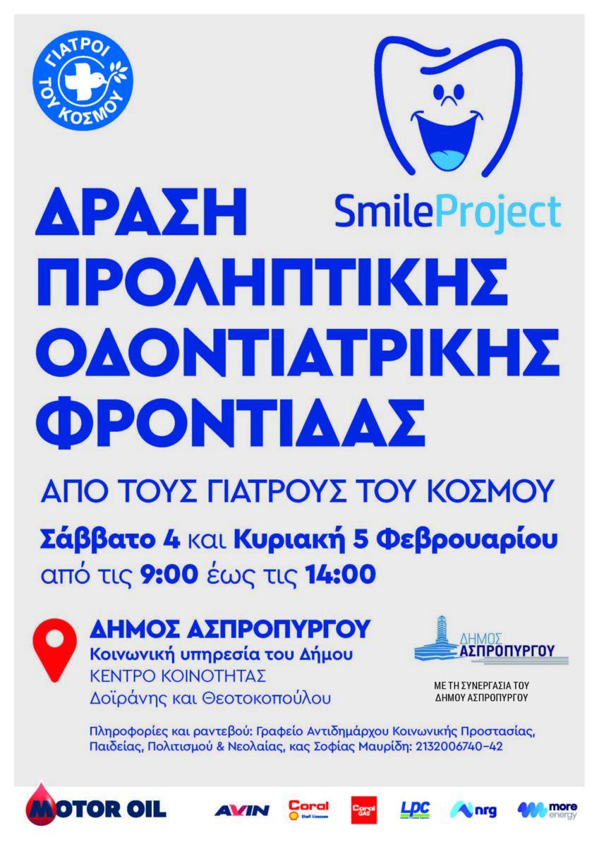 Ο Δήμαρχος Ασπροπύργου, κ. Νικόλαος Μελετίου και η Αντιδήμαρχος Κοινωνικής Προστασίας, Παιδείας, Πολιτισμού και Νεολαίας, κα. Σοφία Μαυρίδη σε συνεργασία με την εταιρεία LPC Hellas και τους Γιατρούς του Κόσμου/Medecins Du Monde, ανταποκρινόμενοι στις ανάγκες της ελληνικής κοινωνίας, σας καλούν να συμμετάσχετε στη Δράση Προληπτικού Οδοντιατρικού Ελέγχου το Σάββατο 4 Φεβρουαρίου και την Κυριακή 5 Φεβρουαρίου 2023 και ώρες 9:00-14:00 στην Κοινωνική Υπηρεσία του Δήμου (Δοϊράνης & Θεοτοκοπούλου) με δωρεάν προληπτικούς οδοντιατρικούς ελέγχους σε κατοίκους και μαθητές της πόλης μας.