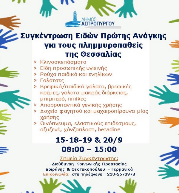 Ο Δήμαρχος Ασπροπύργου, κ. Νικόλαος Μελετίου και ο Αντιδήμαρχος Κοινωνικής Προστασίας, Παιδείας, Πολιτισμού και Νεολαίας, κ. Αβραάμ Κωνσταντινίδης ανακοινώνουν ότι, η Διεύθυνση Κοινωνικής Προστασίας, στηρίζει τους πλημμυροπαθείς συνανθρώπους μας της Θεσσαλίας, που επλήγησαν από τη θεομηνία DANIEL, με τη συγκέντρωση των κάτωθι ειδών πρώτης ανάγκης: