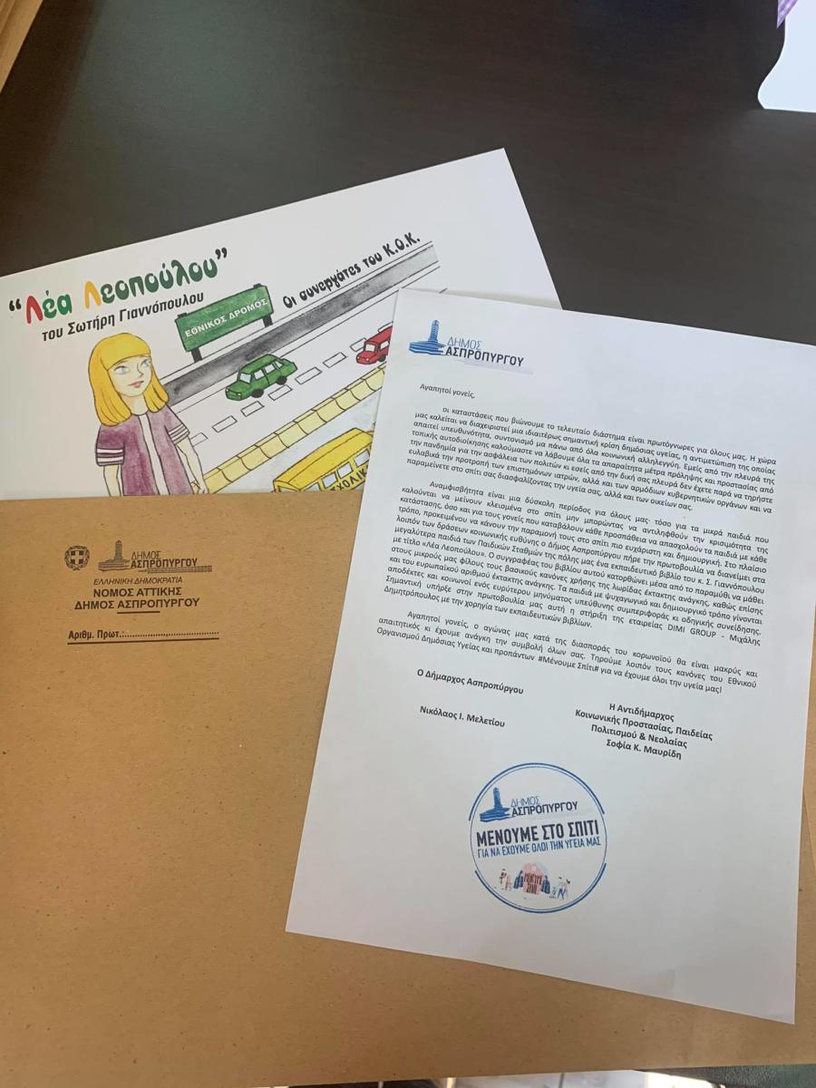Στο πλαίσιο των δράσεων κοινωνικής ευθύνης και στήριξης της εκστρατείας του Υπουργείου Υγείας #Μένουμε Σπίτι#, ο Δήμαρχος Ασπροπύργου, κ. Νικόλαος Μελετίου και η Αντιδήμαρχος Κοινωνικής Προστασίας, Παιδείας, Πολιτισμού και Νεολαίας, κ. Σοφία Μαυρίδη απέστειλαν τις ημέρες του Πάσχα στα γεννημένα το 2015 παιδιά των Παιδικών Σταθμών της πόλης μας το εκπαιδευτικό βιβλίο του κ. Σωτήρη Γιαννόπουλου με τίτλο «Λέα Λεοπούλου».