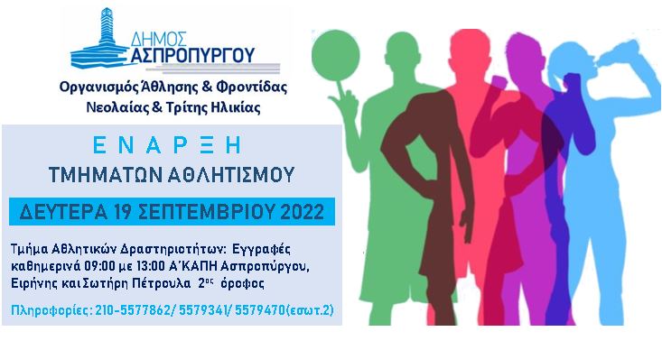 Μια νέα αθλητική περίοδος αρχίζει τη Δευτέρα, 19 Σεπτεμβρίου 2022  και ο Πρόεδρος του Οργανισμού Άθλησης και Φροντίδας, Νεολαίας και Τρίτης Ηλικίας, κ. Ιωάννης Κατσαρός  καλεί όλους τους δημότες, μικρούς και μεγάλους να συμμετάσχουν στα τμήματα αθλητισμού, που πραγματοποιούνται στις εγκαταστάσεις του Δήμου Ασπροπύργου Οι εγγραφές πραγματοποιούνται  καθημερινά από τις 09:00 έως τις 13:00, στο Τμήμα  Αθλητικών Δραστηριοτήτων, στο κτίριο του Α΄ΚΑΠΗ, Ειρήνης και Σωτήρη Πέτρουλα (2ος όροφος), προσκομίζοντας τα παρακάτω δικαιολογητικά: