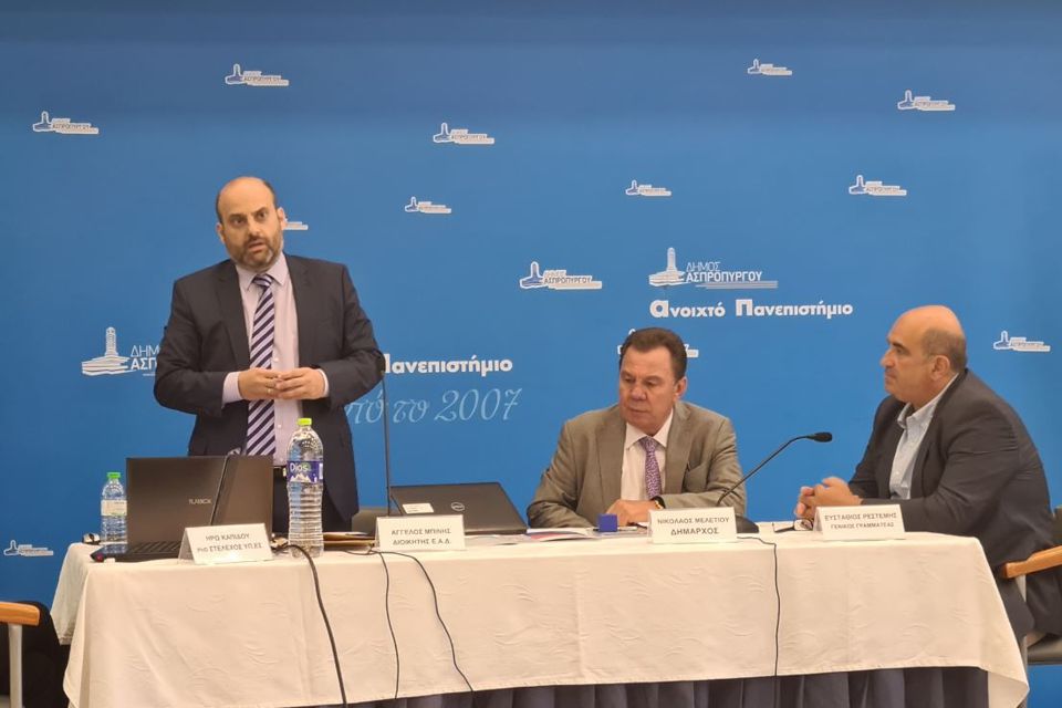 «Αξιότιμέ κύριε Άγγελε Μπίνη, Διοικητά της Ενιαίας Αρχής Διαφάνειας, σας καλωσορίζω στο Δήμο Ασπροπύργου και σας ευχαριστώ για την ανταπόκρισή σας στο κάλεσμα μας στην υπηρεσιακή μας προσπάθεια για την εφαρμογή των λειτουργιών του Εσωτερικού Ελέγχου. Αγαπητοί Συνεργάτες, στελέχη των Υπηρεσιών του Δήμου μας. Βιώνουμε μια εξαιρετικά πρωτόγνωρη συγκυρία μέσα στην οποία είμαστε υποχρεωμένοι καθημερινά να εφαρμόζουμε Πράξεις Νομοθετικού Περιεχομένου και Εγκυκλίους και να προστατεύουμε την Δημόσια Υγεία των πολιτών και των εργαζομένων μας. Ο Δήμος Ασπροπύργου ξεκινά μέσα από αυτή την συνάντηση την ενημέρωση των στελεχών του για την εφαρμογή των λειτουργιών του Εσωτερικού Ελέγχου, όπως προβλέπεται από την σχετική νομοθεσία και τις εγκυκλίους των αρμόδιων αρχών. Έχουμε σήμερα μαζί μας, την κορυφαία θεσμική εκπροσώπηση από την πλευρά της πολιτείας για τον έλεγχο της Διαφάνειας. Θα μου επιτρέψετε να σας πω από την εμπειρία που απέκτησα τα 20 και πλέον χρόνια που υπηρετώ την Αυτοδιοίκηση, ότι οι Δήμοι, «ελέγχονται» για τις πράξεις τους, από ένα μεγάλο αριθμό εποπτικών φορέων, όπως οι υπηρεσίες των Αποκεντρωμένων Διοικήσεων που ελέγχουν μια σειρά διοικητικών πράξεων των Δήμων (π.χ. προϋπολογισμός, αναθεωρήσεις προϋπολογισμού κοκ), οι διατάξεις των νόμων ν.3852/2010 και ν. 4483/2017 σύμφωνα με τους οποίους τηρείται στο Υπουργείο Εσωτερικών ηλεκτρονική βάση καταγραφής των οικονομικών στοιχείων των Δήμων, σχετικά με την πορεία υλοποίησης του προϋπολογισμού τους, καθώς και των απολογιστικών τους στοιχείων. Ο προ συμβατικός έλεγχος από το ελεγκτικό συνέδριο για Προμήθειες, και έργα των Δήμων άνω συγκεκριμένων χρηματικών ορίων. Ο «Συνήγορος του Πολίτη» ως Ανεξάρτητη Αρχή διερευνά αναφορές, πολιτών, για μια σειρά θεμάτων που άπτονται των δημοτικών υπηρεσιών.