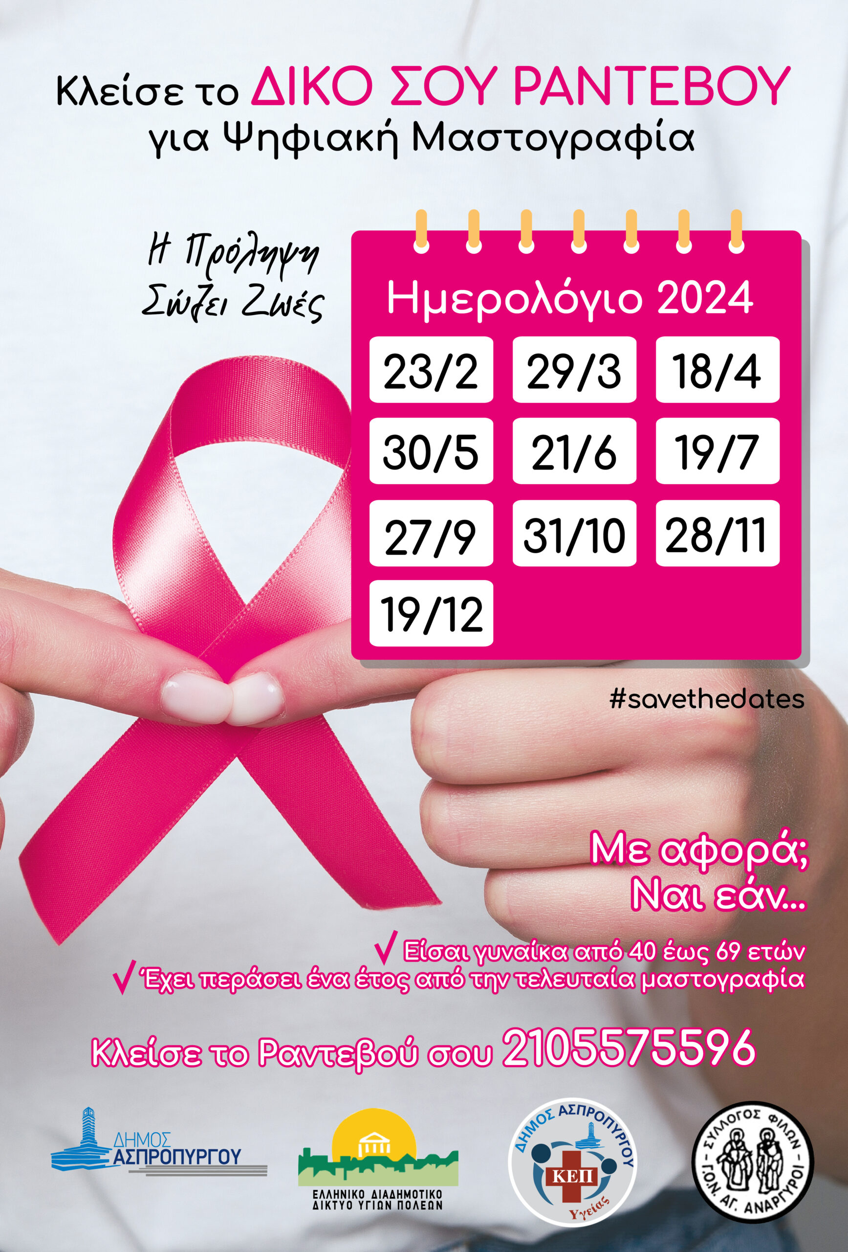 Ο Δήμος Ασπροπύργου, η Αντιδήμαρχος της Διεύθυνσης Κοινωνικής Προστασίας κα Ελένη Μαυράκη- Τσίγκου και το ΚΕΠ Υγείας , σε συνεργασία με το ΕΔΔΥΠΠΥ και τον Σύλλογο Φίλων του Ογκολογικού Νοσοκομείου «ΟΙ ΑΓΙΟΙ ΑΝΑΡΓΥΡΟΙ» συνεχίζουν την υλοποίηση του Προγράμματος Ψηφιακών Μαστογραφιών και σας παραθέτουν τις διαθέσιμες ημερομηνίες μέχρι το τέλος του έτους 2024.