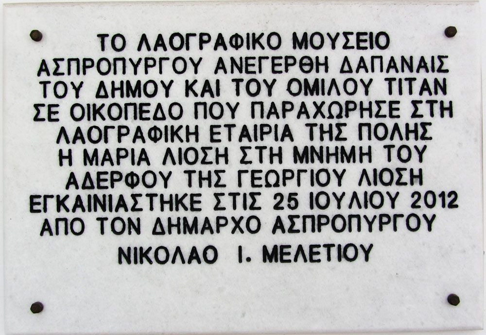 Το Λαογραφικό Μουσείο Ασπροπύργου ιδρύθηκε το 2012, από το Δήμο Ασπροπύργου και τη Λαογραφική Εταιρεία της πόλης.