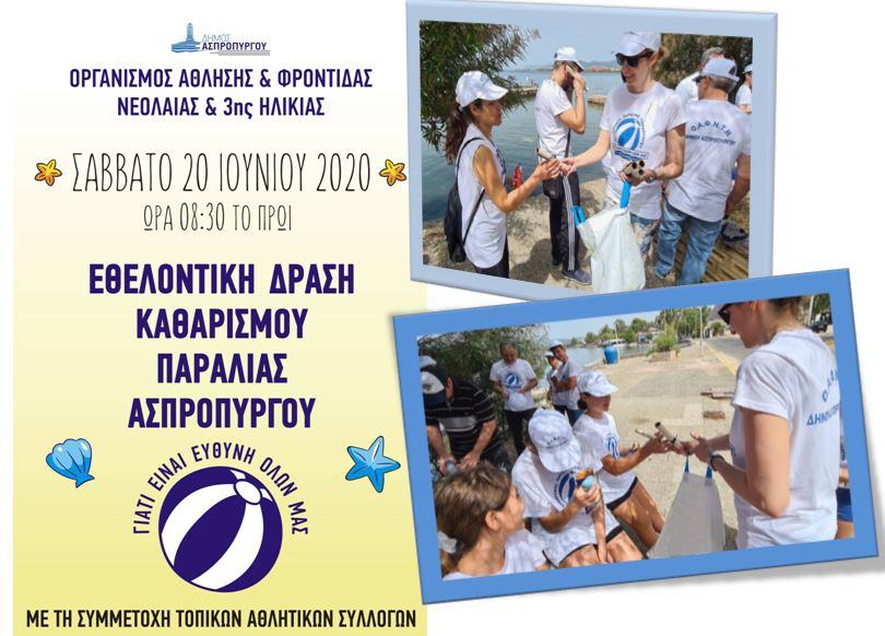 Με σύνθημα «ΚΑΘΑΡΙΖΟΥΜΕ ΤΗΝ ΠΑΡΑΛΙΑ ΜΑΣ – ΓΙΑΤΙ ΕΙΝΑΙ ΕΥΘΥΝΗ ΟΛΩΝ ΜΑΣ» ξεκίνησε το πρωί του Σαββάτου, 20 Ιουνίου 2020 το προσωπικό του Οργανισμού Άθλησης και Φροντίδας, Νεολαίας και Τρίτης Ηλικίας μαζί με μικρούς και μεγάλους εθελοντές των αθλητικών συλλόγων της πόλης τον καθαρισμό της Παραλίας Ασπροπύργου.