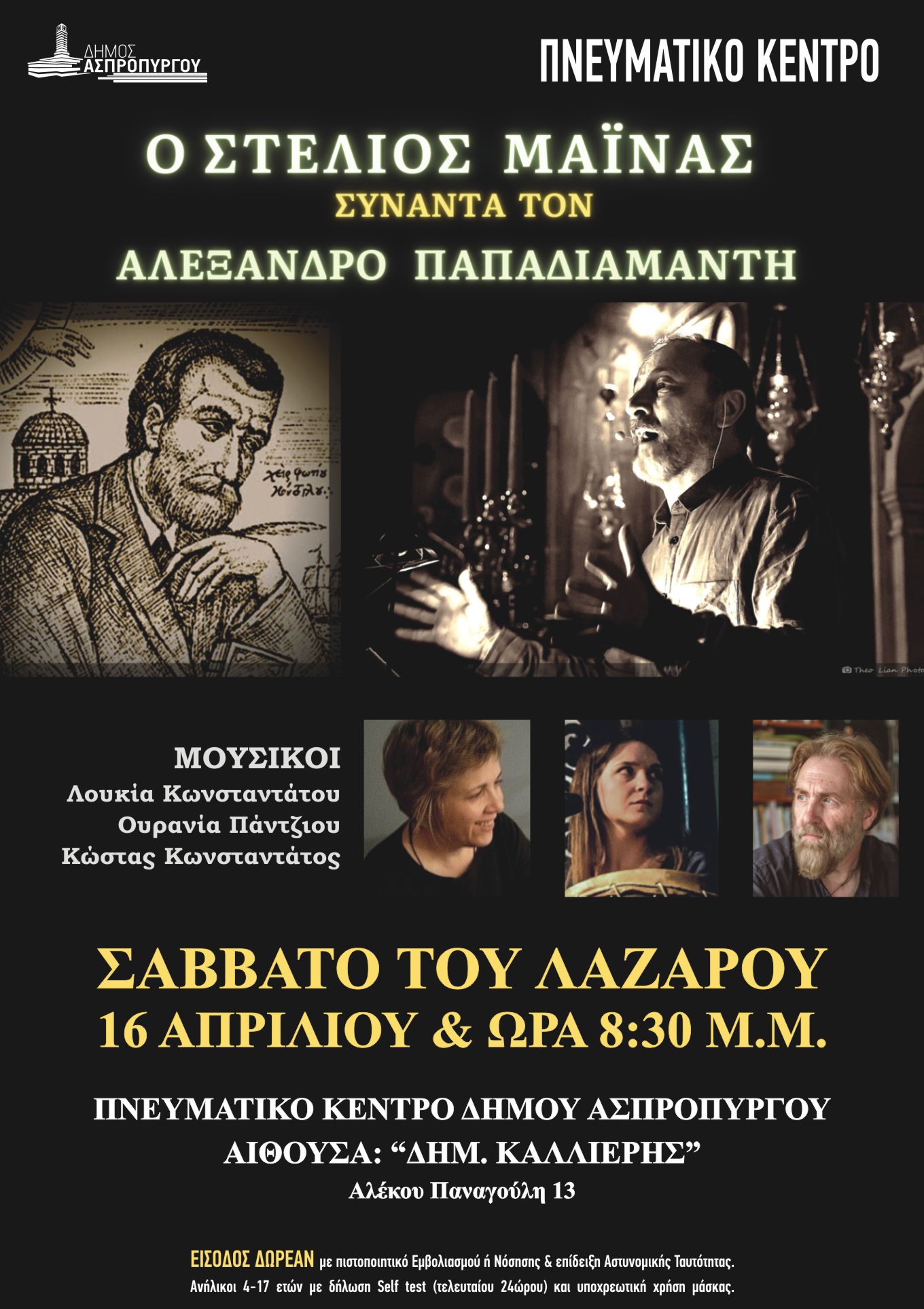 Ο ηθοποιός ΣΤΕΛΙΟΣ ΜΑΪΝΑΣ συναντά τον ΑΛΕΞΑΝΔΡΟ ΠΑΠΑΔΙΑΜΑΝΤΗ και διαβάζει μερικά από τα αριστουργηματικά του διηγήματα, όπως τα «Μυρολόγι της φώκιας», «Έρως – Ήρως», «Παιδική Πασχαλιά».