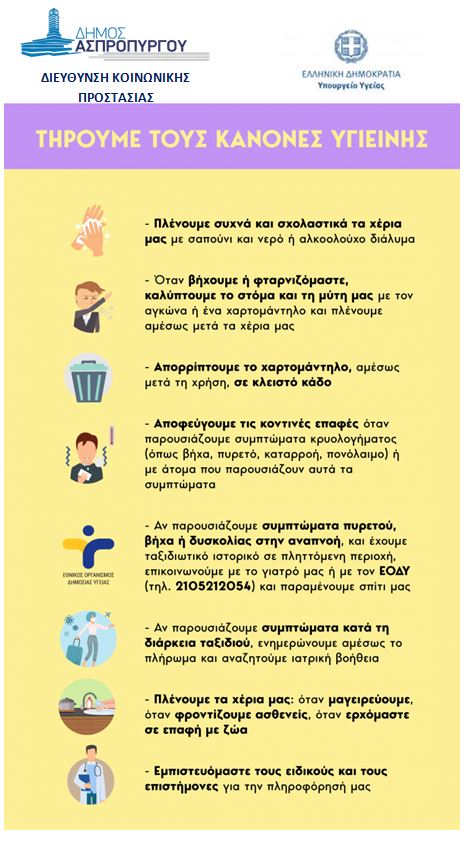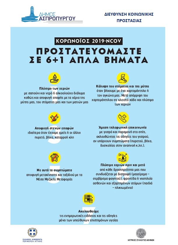 Οδηγίες Προστασίας από τον Κορωνοϊό Τετάρτη, 04 Μαρ 2020 2:20 μμ | Ανακοινώσεις, Δελτία Τύπου, Υγεία Οδηγίες Προστασίας από τον Κορωνοϊό Τηρούμε τους Κανόνες Υγιεινής Προστατευόμαστε σε 6+1 Απλά Βήματα