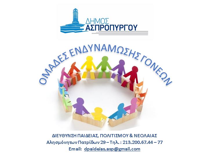 Ο Δήμαρχος Ασπροπύργου, κ. Νικόλαος Μελετίου και η Αντιδήμαρχος Κοινωνικής Προστασίας, Παιδείας, Πολιτισμού και Νεολαίας, κ. Σοφία Μαυρίδη σας καλούν να συμμετέχετε στις ΟΜΑΔΕΣ ΕΝΔΥΝΑΜΩΣΗΣ ΓΟΝΕΩΝ για παιδιά προσχολικής ηλικίας, οι οποίες θα λειτουργήσουν για πρώτη φορά φέτος, στις δομές της Διεύθυνσης Παιδείας, Πολιτισμού & Νεολαίας του Δήμου.