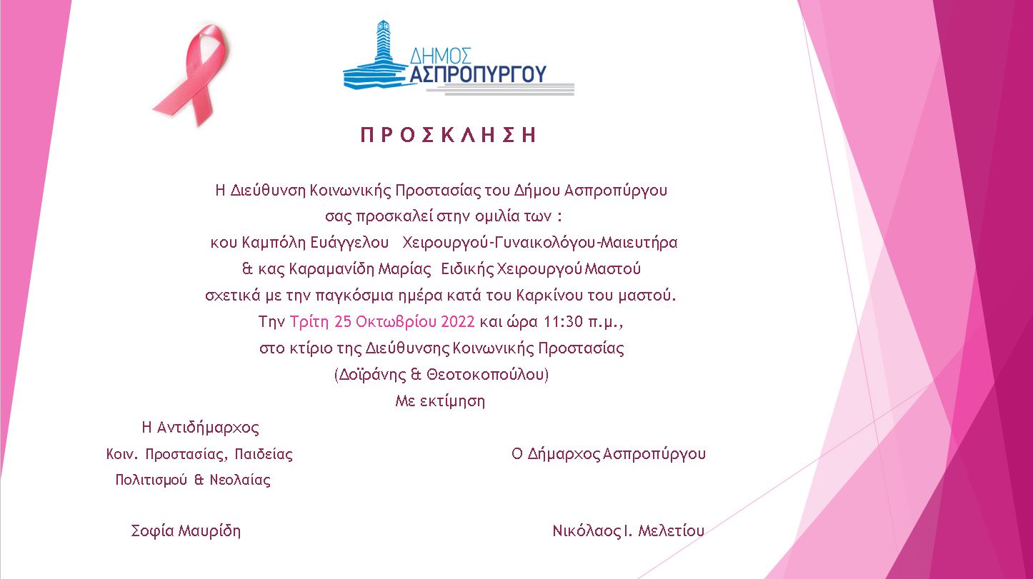 Με αφορμή την Παγκόσμια Ημέρα κατά του Καρκίνου του Μαστού, ο Δήμαρχος Ασπροπύργου, κ. Νικόλαος Μελετίου και η Αντιδήμαρχος Κοινωνικής Προστασίας, Παιδείας, Πολιτισμού και Νεολαίας, κ. Σοφία Μαυρίδη, σας προσκαλούν σε ενημερωτική ομιλία αναφορικά με τον Καρκίνο του Μαστού, του κ. Ευάγγελου Καμπόλη – Χειρουργού – Γυναικολόγου – Μαιευτήρα και της κ. Μαρίας Καραμανίδη – Ειδική Χειρουργός Μαστού, που διοργανώνει η Διεύθυνση Κοινωνικής Προστασίας.