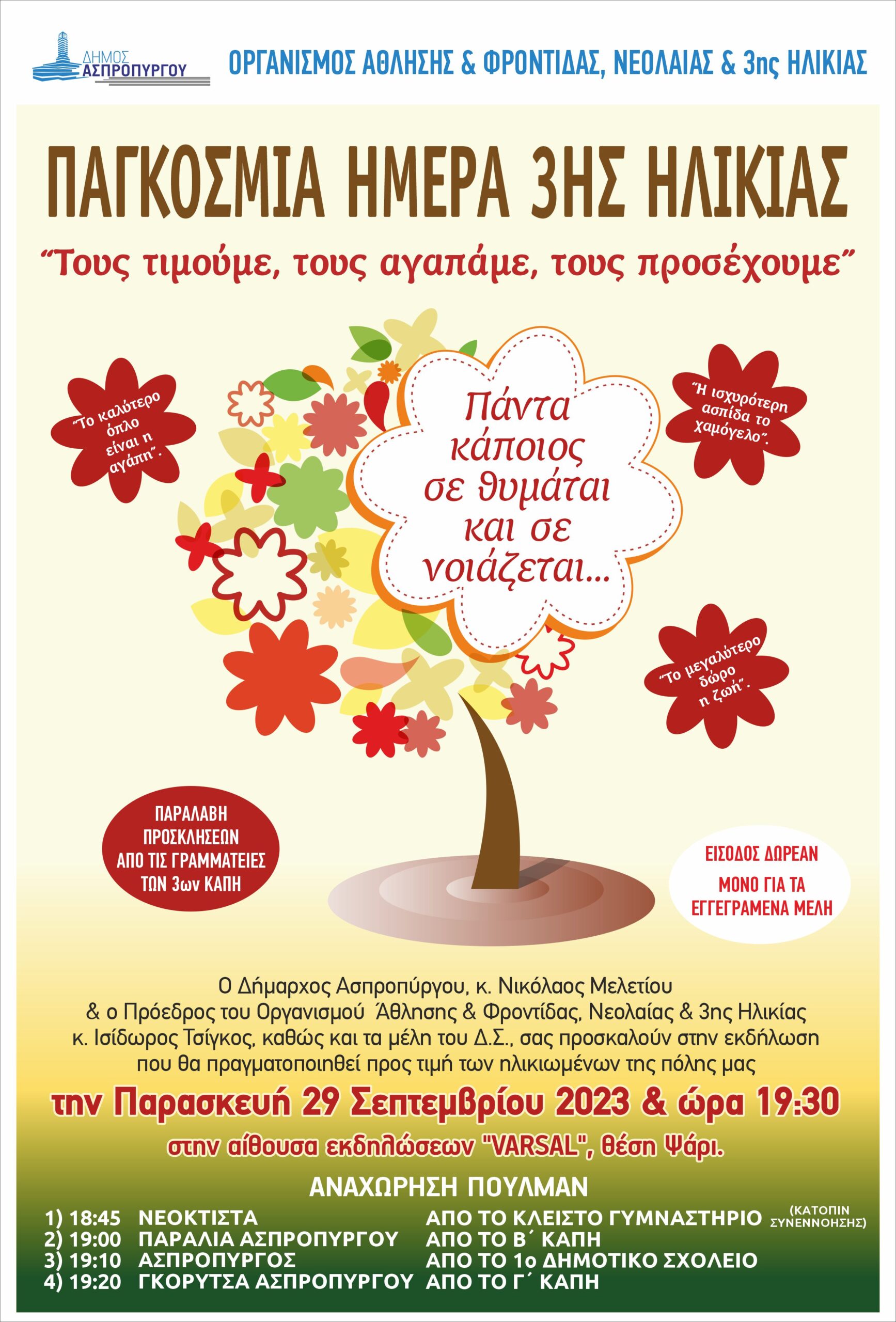Ο Δήμαρχος Ασπροπύργου, κ. Νικόλαος Μελετίου, ο Πρόεδρος του Οργανισμού Άθλησης και Φροντίδας, Νεολαίας και Τρίτης Ηλικίας, κ. Ισίδωρος Τσίγκος, με αφορμή την Παγκόσμια Ημέρα για την Τρίτη Ηλικία, προσκαλούν όλα τα μέλη των ΚΑΠΗ σε εκδήλωση που θα πραγματοποιηθεί προς τιμήν τους, την Παρασκευή, 29 Σεπτεμβρίου 2023 στις 19:30 στην αίθουσα εκδηλώσεων “VARSAL”, στη θέση Ψάρι.