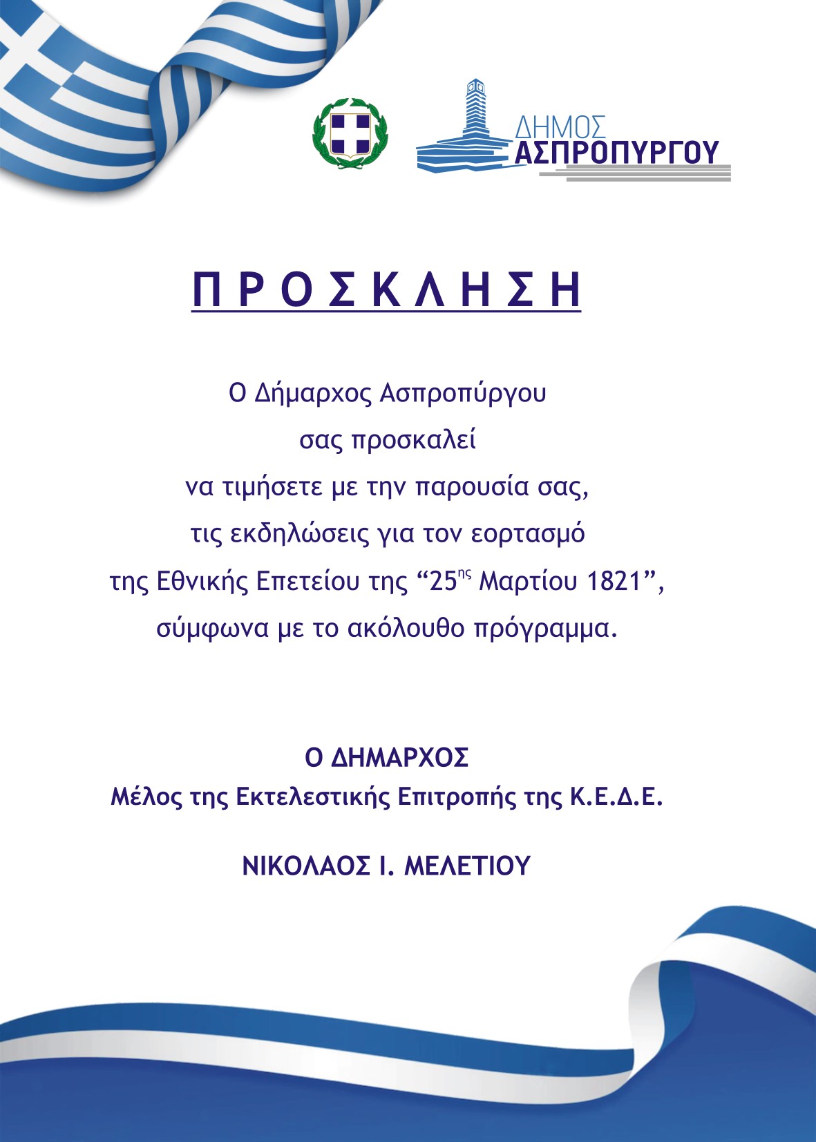 ΠΡΟΓΡΑΜΜΑ ΕΟΡΤΑΣΜΟΥ ΤΗΣ ΕΘΝΙΚΗΣ ΕΠΕΤΕΙΟΥ 25ης ΜΑΡΤΙΟΥ 1821 Πέμπτη, 23 Μαρ 2023 12:30 μμ | Δελτία Τύπου Κατέβασε το Αρχείο