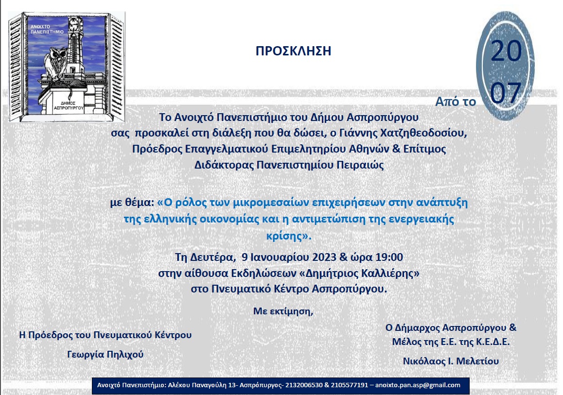 Ο Δήμαρχος Ασπροπύργου, κ. Νικόλαος Μελετίου και η Πρόεδρος του Πνευματικού Κέντρου,  κ. Γεωργία Πηλιχού,  σας καλωσορίζουν στον νέο κύκλο διαλέξεων του 2023, και σας προσκαλούν στη διάλεξη του Ανοιχτού Πανεπιστημίου Ασπροπύργου, που θα δώσει ο Γιάννης Χατζηθεοδοσίου, Πρόεδρος Επαγγελματικού Επιμελητηρίου Αθηνών & Επίτιμος Διδάκτορας Πανεπιστημίου Πειραιώς, με τίτλο: ,  «Ο ρόλος των μικρομεσαίων επιχειρήσεων στην ανάπτυξη της ελληνικής οικονομίας και η αντιμετώπιση της ενεργειακής κρίσης». Η διάλεξη θα πραγματοποιηθεί τη Δευτέρα, 9 Ιανουαρίου 2023, στις 19:00, στην Αίθουσα Εκδηλώσεων «Δημήτριος Καλλιέρης» του Πνευματικού Κέντρου, Αλέκου Παναγούλη 13 στην Πλατεία του Αγίου Δημητρίου. Η  είσοδος είναι ελεύθερη.  Για περισσότερες πληροφορίες μπορείτε να  επικοινωνείτε στα τηλ: 2132006530 και 2105577191 εσωτ.:4  – anoixto.pan.asp@gmail.com