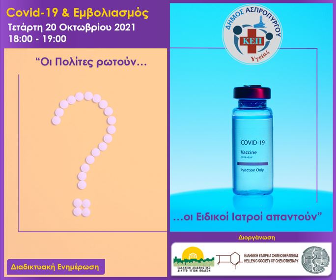 Tο ΚΕΠ Υγείας του Δήμου Ασπροπύργου σε συνεργασία με το Ελληνικό Διαδημοτικό Δίκτυο Υγιών Πόλεων, σας προσκαλεί να συμμετάσχετε, στη νέα Καμπάνια Ενημέρωσης με τίτλο: “Covid-19 & Εμβολιασμός – Οι πολίτες ρωτούν, οι Ειδικοί Ιατροί απαντούν”, η οποία πραγματοποιείται με τη συνεργασία της Ελληνικής Εταιρείας Χημειοθεραπείας και τον Ιατρικό Σύλλογο Αθηνών.