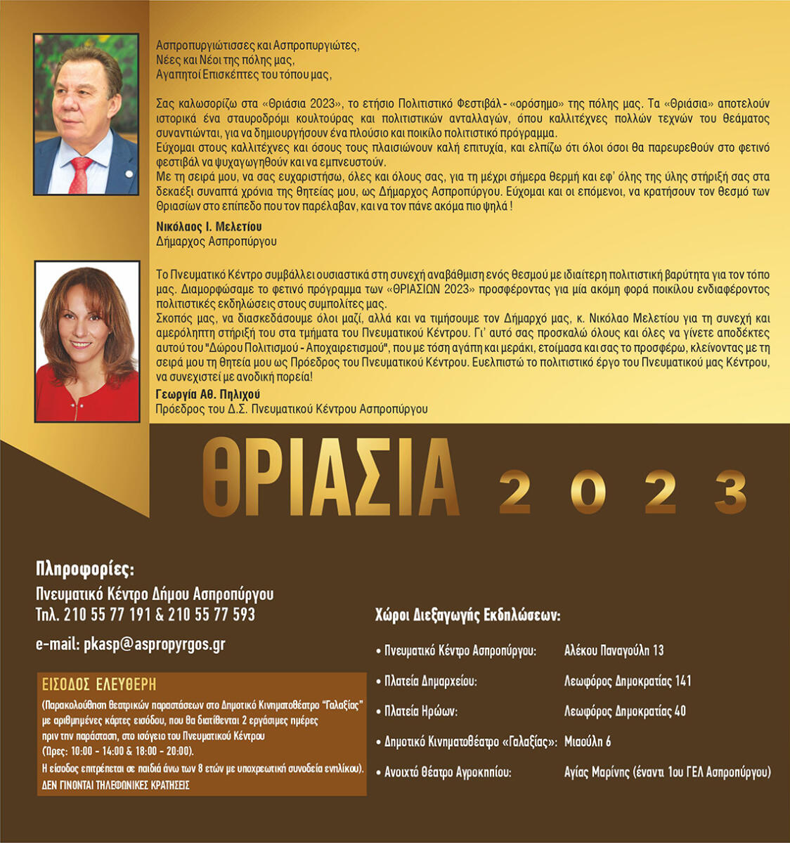 Ο Δήμαρχος Ασπροπύργου, κ. Νικόλαος Μελετίου και η Πρόεδρος του Πνευματικού Κέντρου, κ. Γεωργία Πηλιχού καλούν όλες και όλους να γίνουν αποδέκτες του «Δώρου Πολιτισμού», «ΘΡΙΑΣΙΑ 2023» μιας και αποτελούν ιστορικά ένα σταυροδρόμι κουλτούρας και πολιτιστικών ανταλλαγών, που δωρεάν προσφέρουν σε όλους τους συμπολίτες τους.